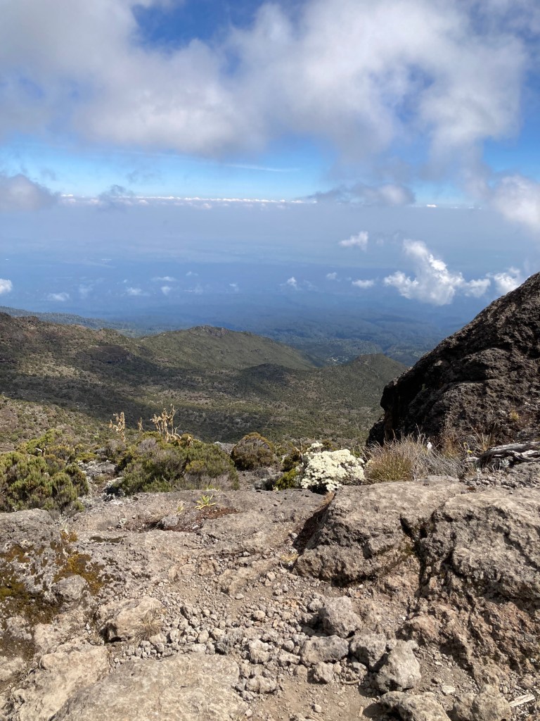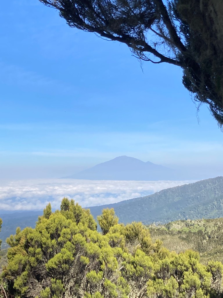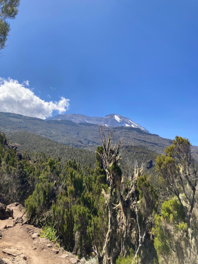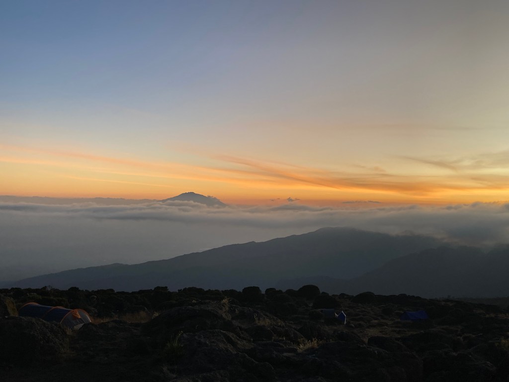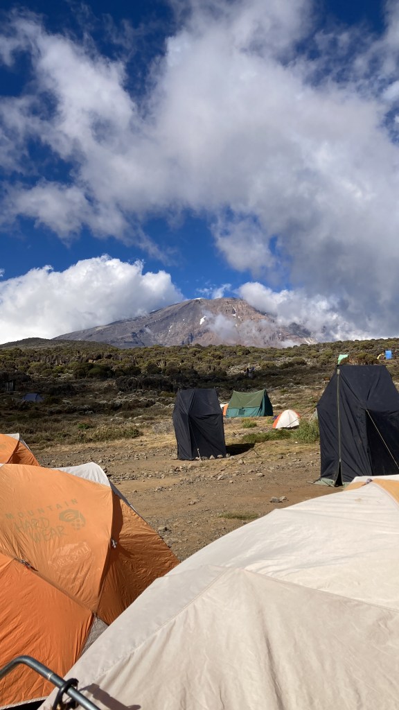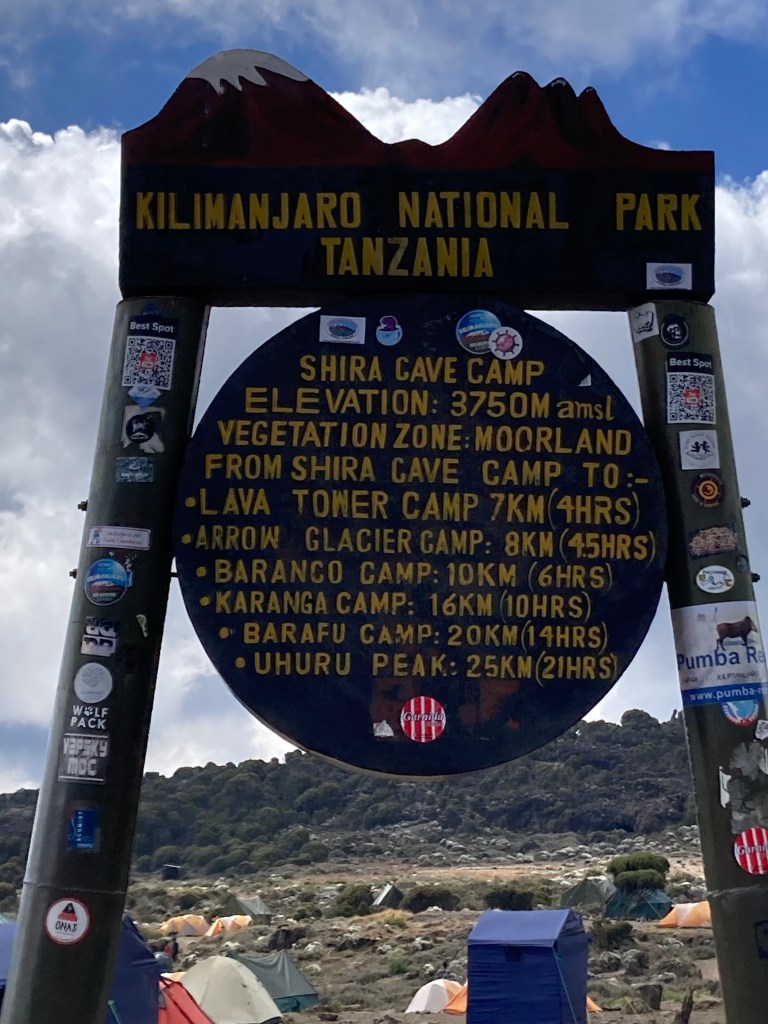 We set off with Shira Cave Camp as our goal for the day. Today was much steeper and the pathway was a combination of rock and steps made from tree roots. Steps that were definitely made for people with longer legs than mine! We ascended out of the rainforest, through clouds, and into the moorland vegetation zone. The whole group found today much tougher than yesterday, but we finally made it to Shira Cave Camp sitting at 3750m by mid-afternoon, and located our camp which was ready & waiting for us, thanks to the amazing team of porters we had supporting us. They even had hot drinks and popcorn waiting for us!