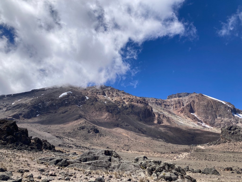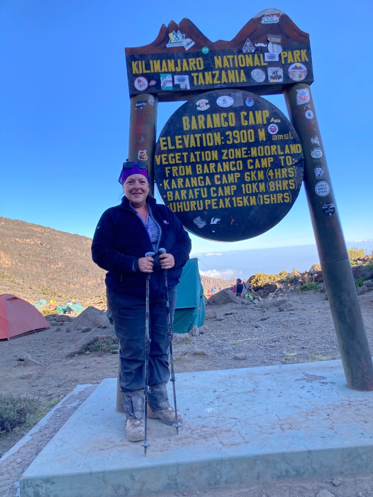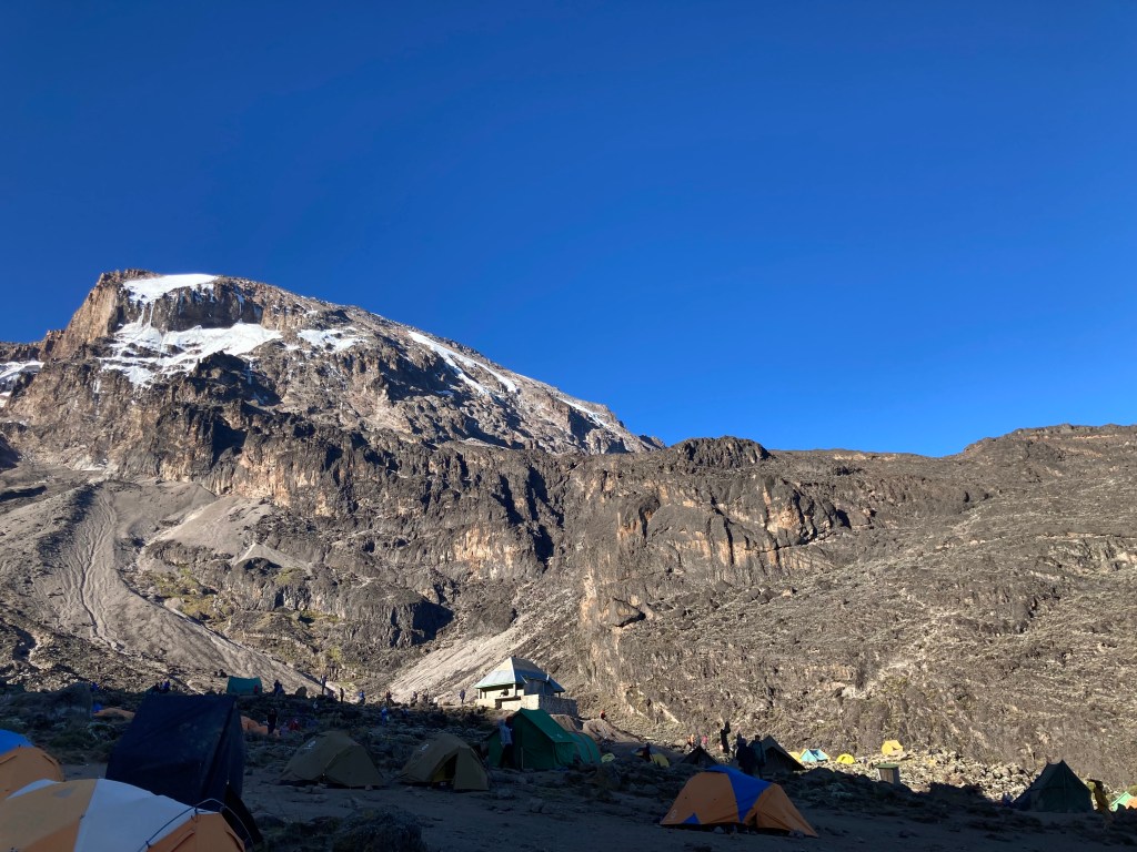 After lunch we headed down to Baranco Camp for the night, our porters racing past us with the mess tent so they’d be set up ready for when we arrived at camp later. A couple of the group had experienced some altitude symptoms during the day, but the descent had cleared these for them and we arrived at Baranco Camp at 3900m, ready to settle in for the night after dinner with the Baranco Wall looming over us as it waited for us tomorrow.